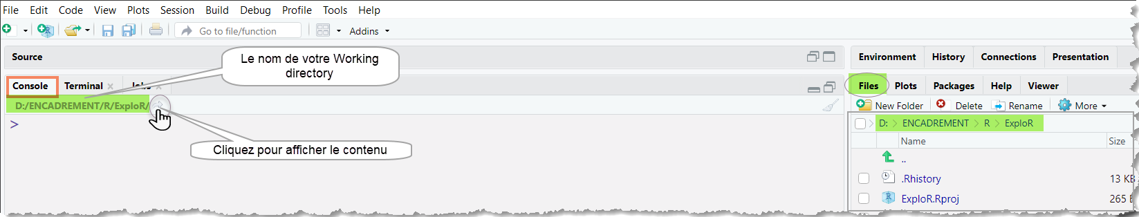 En cliquant sur la petite icône en forme de flèche située à côté du nom du working directory, le contenu de ce dossier s’affiche dans le coin inférieur droit de RStudio, dans le volet Files.