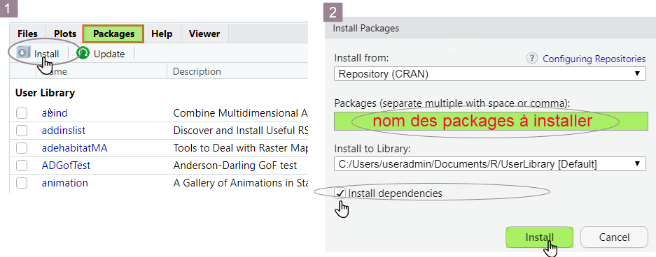 - Installation : cette opération consiste à télécharger le package depuis Internet et à l’enregistrer localement dans un dossier du disque dur. Cette opération ne doit être effectuée qu’une seule fois.