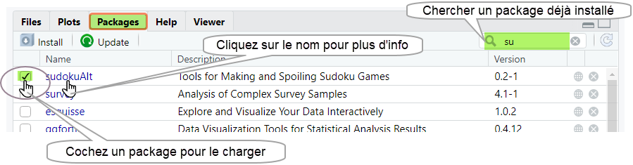 require(nom_pack)Par exemple, pour charger le package sudokuAlt, il suffit de taper : library(sudokuAlt) ou library("sudokuAlt"). Il est également possible de charger un package en cochant son nom dans la liste des packages disponibles, accessible via l’onglet Packages de RStudio comme illustré dans la capture d’écran ci-dessus.
