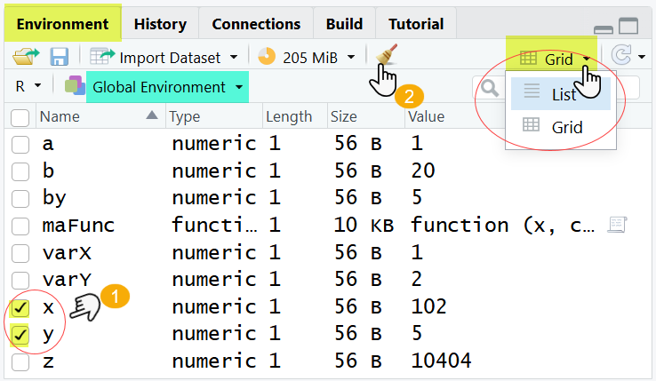 rm(x, y)Vous pouvez également utiliser l’onglet Environment pour sélectionner un ou plusieurs objets en cochant simplement la petite case située devant chacun d’eux. Ensuite, vous pourrez le(s) supprimer en appuyant sur l’icône en forme de balai, comme indiqué dans la capture ci-dessus.