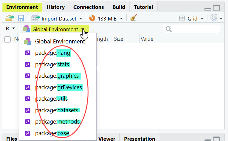 Lorsqu’on appelle un objet par son nom, R suit un ordre précis pour le localiser et l’afficher : Il commence par chercher dans l’environnement .GlobalEnv. Si l’objet n’y est pas trouvé, la recherche se poursuit dans les environnements des packages attachés, en respectant l’ordre dans lequel ceux‑ci ont été chargés au cours de la session. Cette hiérarchie de recherche peut être consultée à l’aide de la fonction search() (ou via le le menue Environment; voir Figure 2.1) :