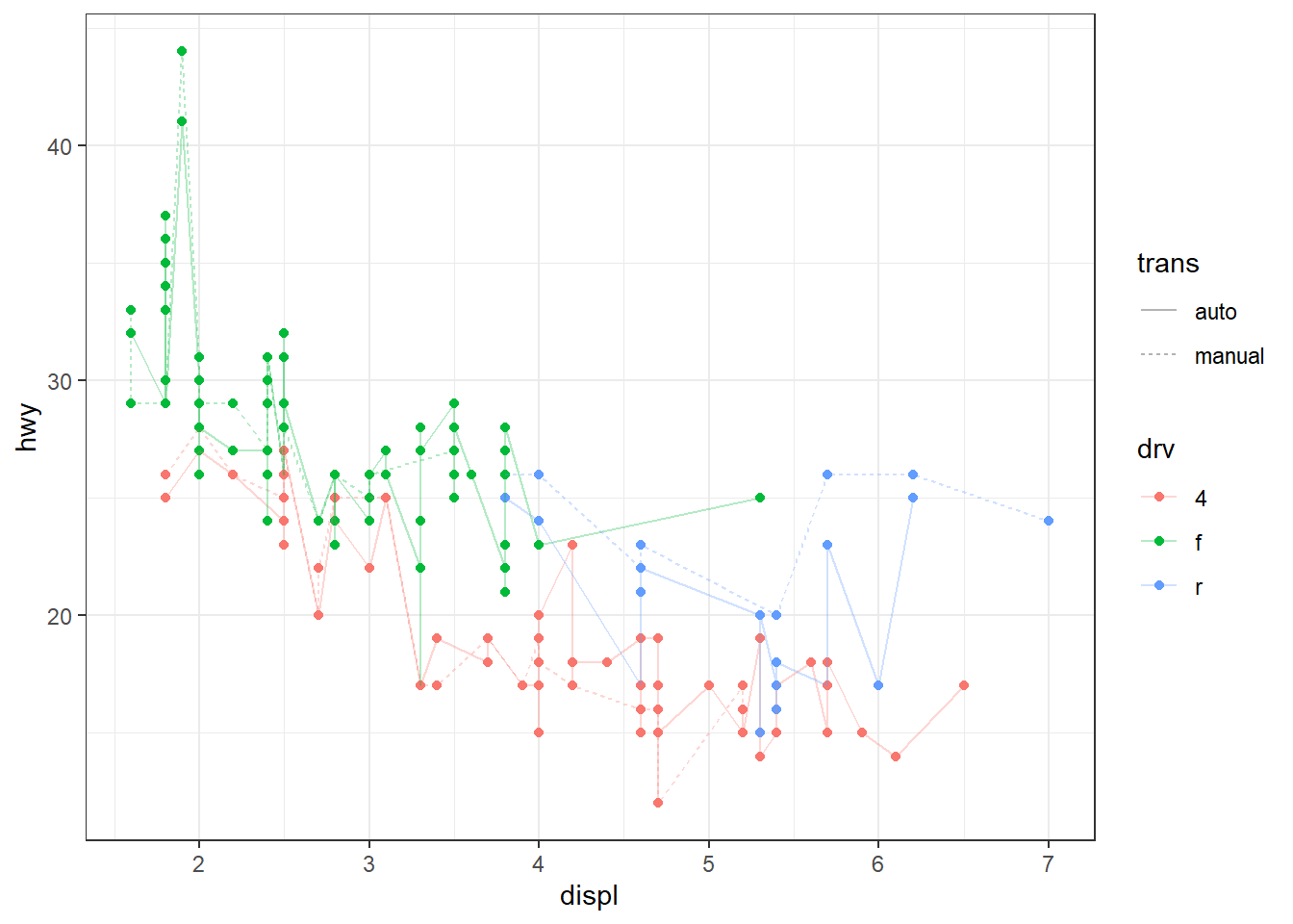 p1 <- ggplot(mpg, aes(x = displ, y = hwy, col = drv)) + geom_point()