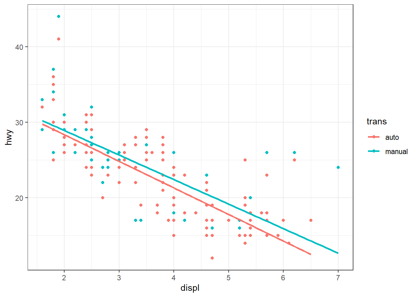 p <- ggplot(mpg, mapping = aes(x = displ, y = hwy)) + geom_point() +