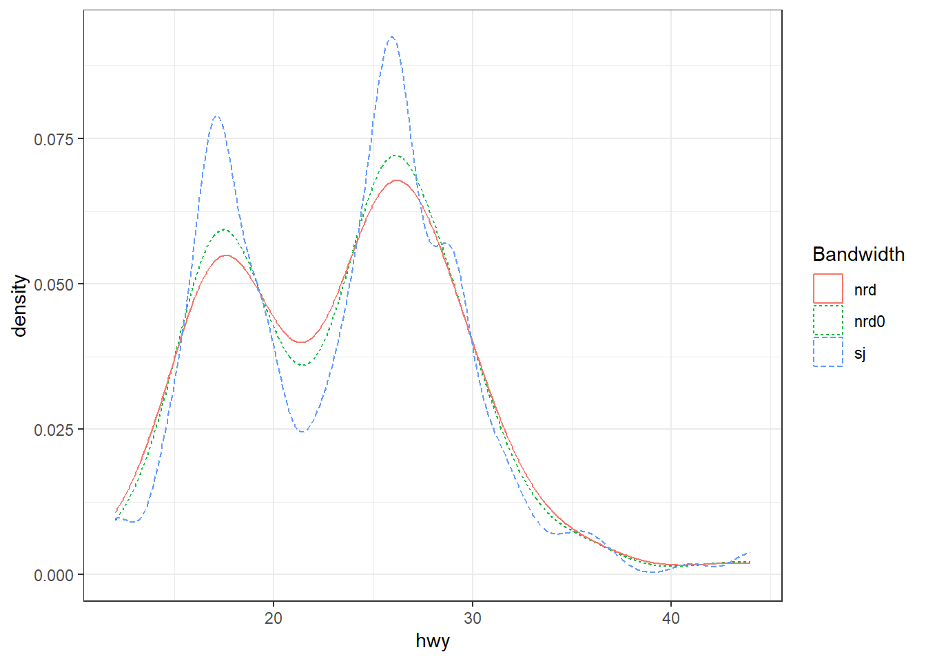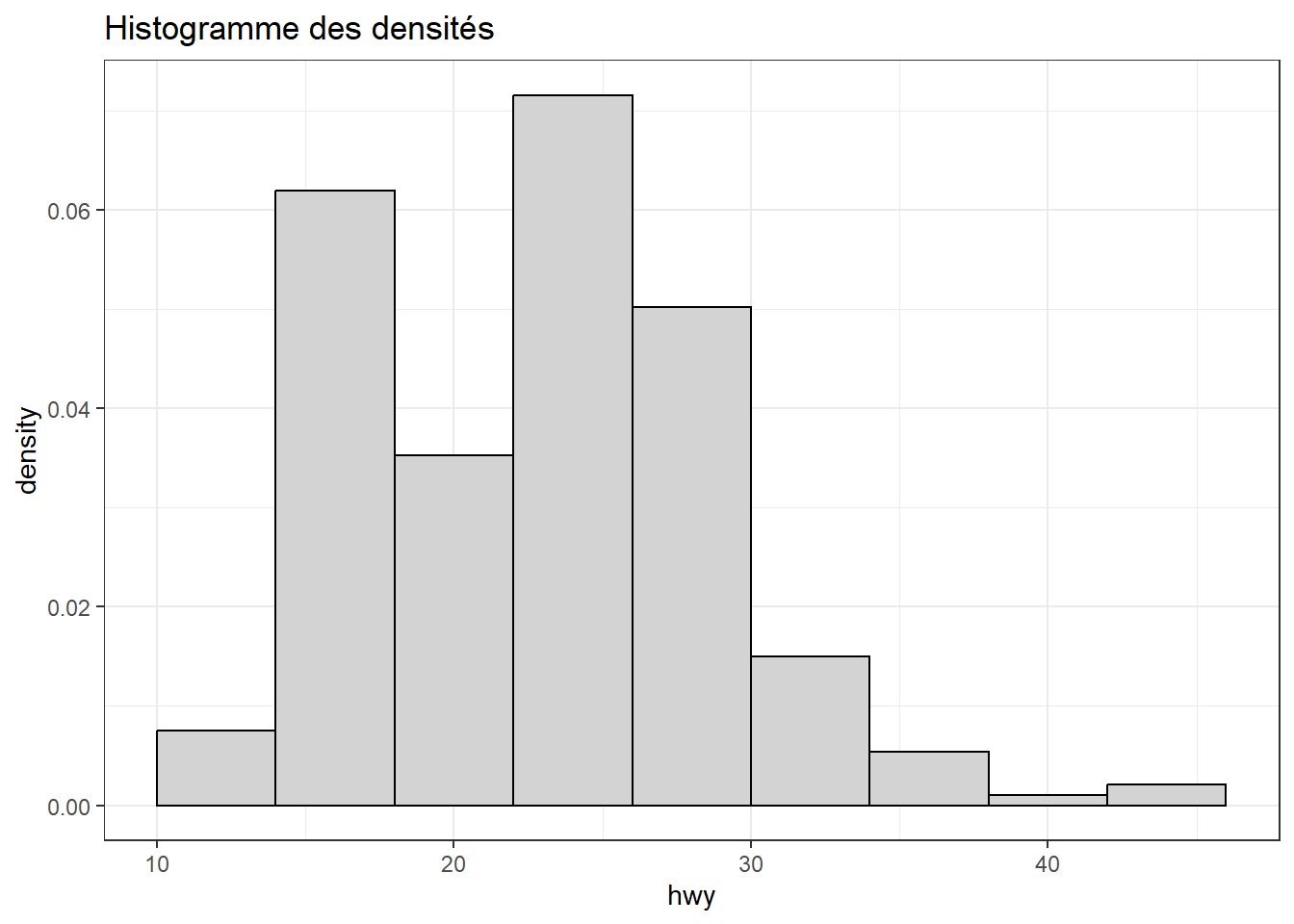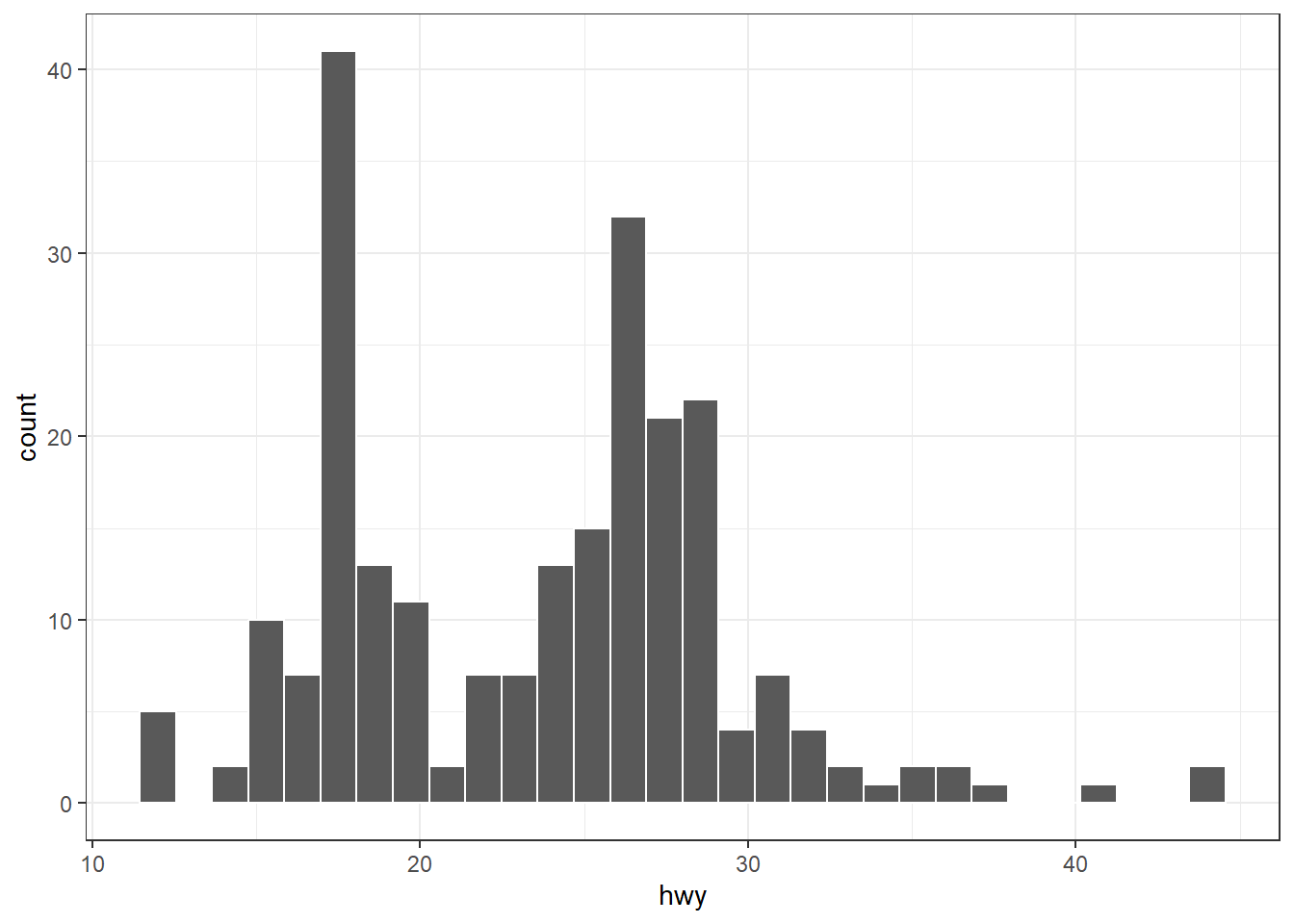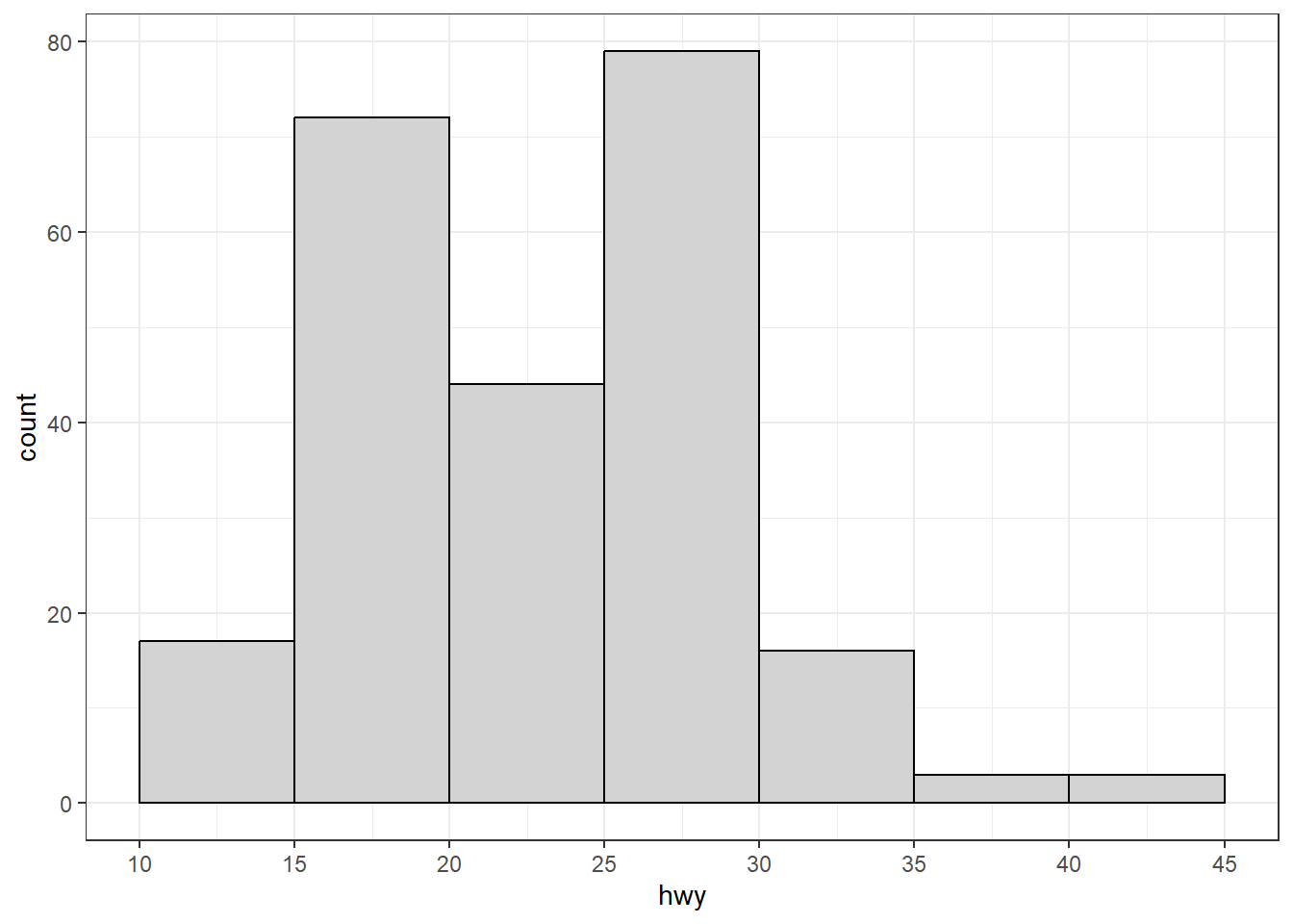p3 <- ggplot(mpg, aes(x = hwy)) + geom_histogram(bins = 9, color = "white")