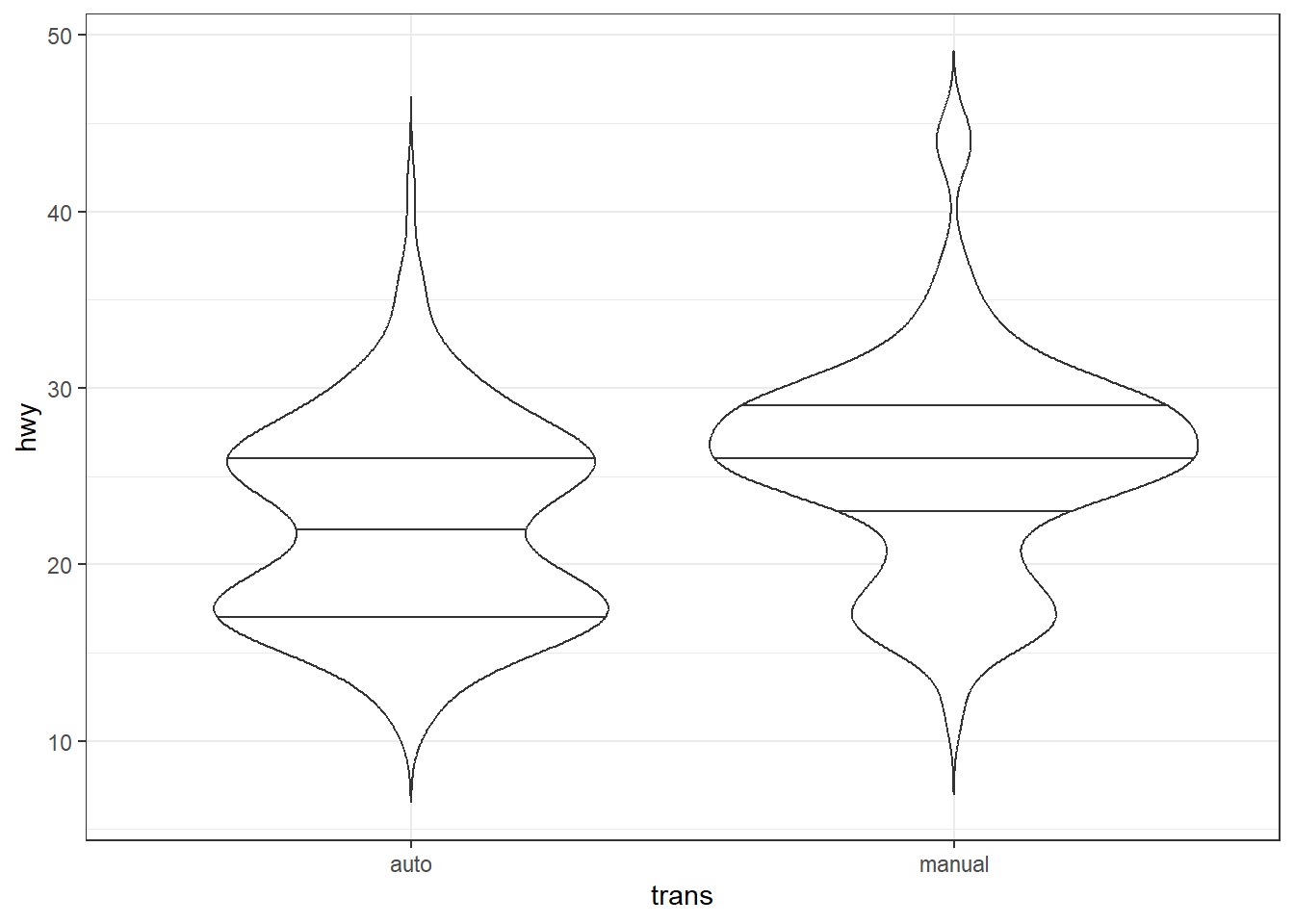 p2 <- ggplot(mpg, aes(x = drv, y = hwy, col = drv)) + geom_boxplot(show.legend = FALSE)