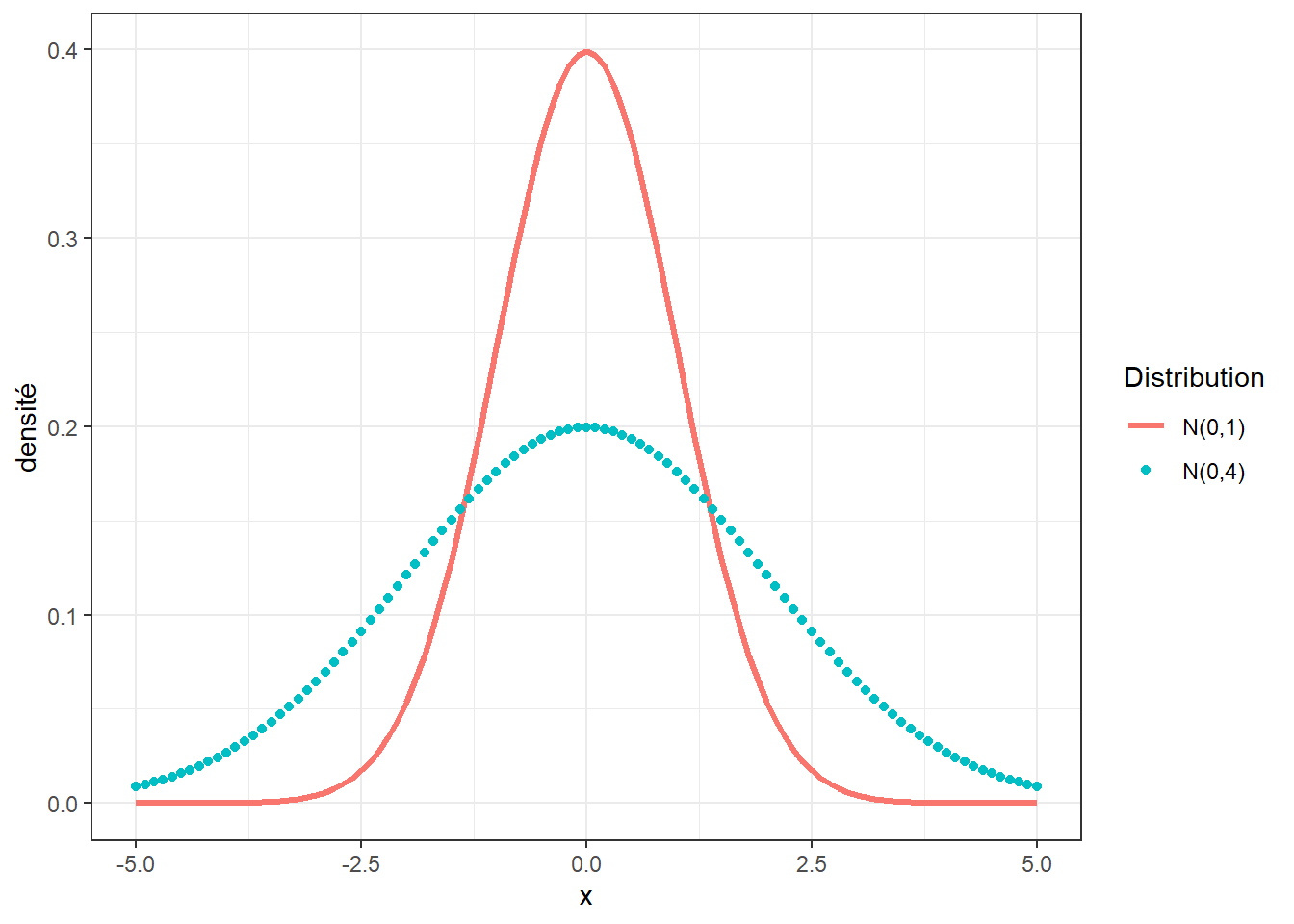 labs(y = "densité", color = "Distribution")
