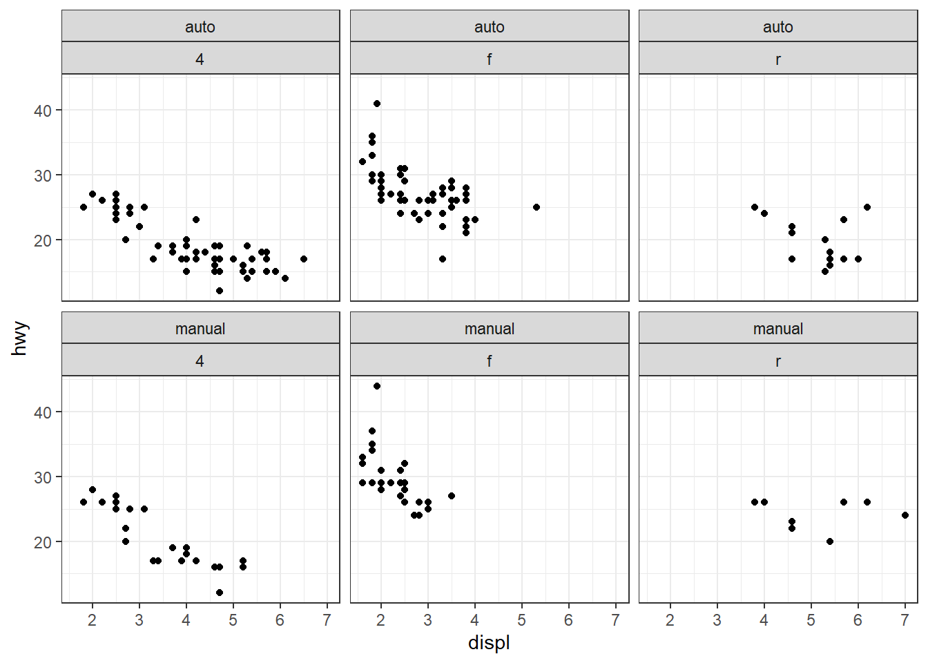 facet_grid(row = vars(drv), cols = vars(trans))