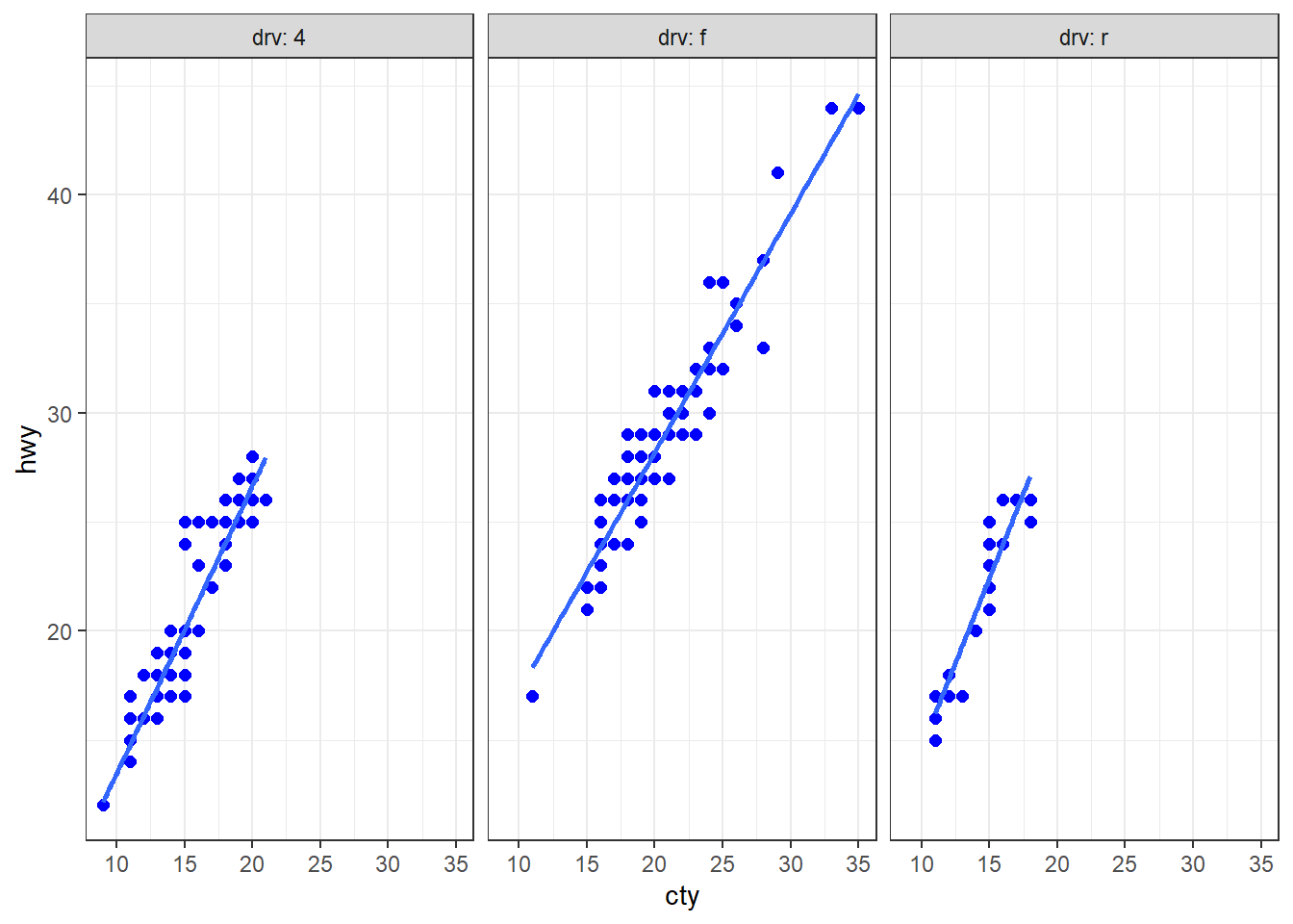 ggplot(mpg, aes(x = cty, y = hwy)) + facet_wrap(facets = vars(drv), labeller = label_both) + mytmpUne autre solution, plus robuste et plus générale, consiste à définir une fonction qui génère le même type de graphique, tout en permettant de modifier certains arguments. Exemple :