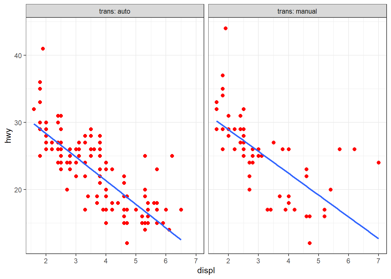 facet_wrap(facets = vars(trans), labeller = label_both) + theme_bw()Si des éléments, non-data, tels que geom_point(color = "blue", size = 2) + geom_smooth(linewidth = 1, se = FALSE) + theme_bw() doivent être répétés à plusieurs reprises, il est possible de les sauvegarder dans une liste et de les réutiliser :